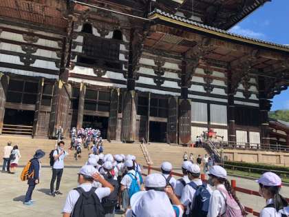 5年生になって初めての校外学習です。奈良公園に行きました。近鉄奈良駅を出ると早速シカに出会い、子どもたちは大興奮でした。東大寺では、大仏の大きさにびっくりしていました。来年の歴史の学習に生かせられるといいですね。飛火野で昼食をとり、たくさん体を動かしました。今日はゆっくり休んでまた明日からも頑張りましょう!