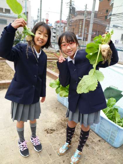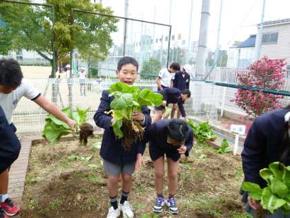 5年生と6年生の児童が、秋から育てた天満菜と天王寺かぶらを収穫しました。