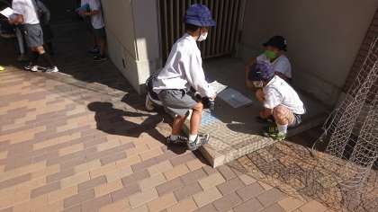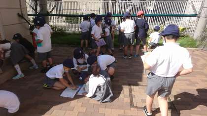 理科の観察で、日かげと日なたの地面の違いについて、明るさ、あたたかさ、しめりぐあいについて、実際に手で触れて観察しました。