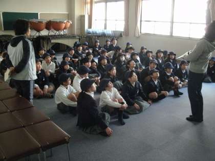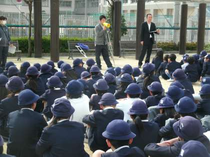 始めに地震による避難訓練として運動場へ避難した後、津波による避難訓練として全員が4階まで避難しました。