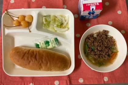 今日のこんだて【コッペパン、マーガリン、タンタンめん、キャベツの甘酢づけ、さくらんぼ(缶)】