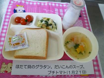 ほたて貝のグラタンは、貝の煮汁も使い、うまみがたっぷり出ていました。スープのにんじん・だいこんがクマの形になった「ラッキー野菜」が入っていました。紅白のクマがそろうと、さらにラッキー!