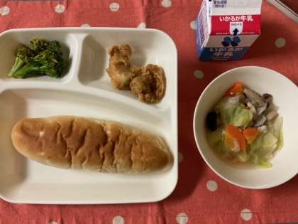 今日のこんだて【おさつパン、白身魚のフリッター、洋風煮、ブロッコリーのサラダ、牛乳】