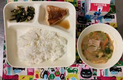 今日のこんだて【ごはん、あかうおのしょうゆだれかけ、みそ汁、こまつなのいためもの、牛乳】