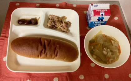 今日のこんだて【黒糖パン、豚肉のデミグラスソース、スープ、うずら豆のグラッセ、牛乳】