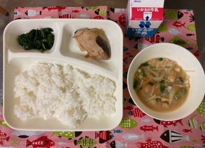 今日のこんだて【ごはん、なまりぶしのしょうが煮、みそ汁。ほうれんそうのおひたし、牛乳】
