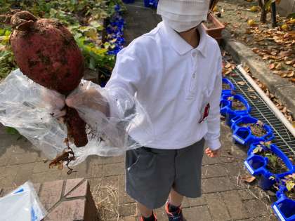 雨にも負けず、風にも負けず、ぐんぐん育っていったおいもは、なんと!!!子どもたちの顔よりも大きく育っているものもありました!