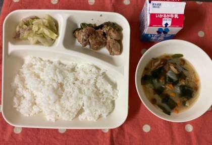 今日のこんだて【ごはん、鶏肉のごまだれ焼き、なめこのみそ汁、キャベツのいためもの、牛乳】