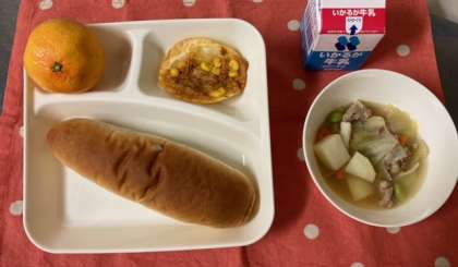 今日のこんだて【レーズンパン、豚肉と野菜のスープ煮、変わりピザ、みかん、牛乳】