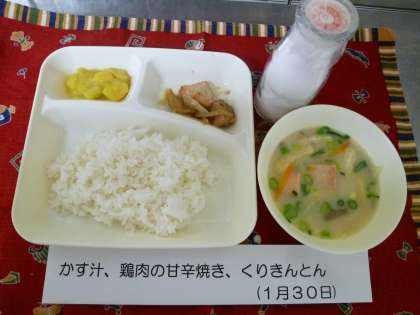 関西が発祥といわれるかす汁にはさけの切り身やこんにゃく、ネギなどが入っていて、体がぽかぽかとあたたまりました。鶏肉はしっかり味がついていて、ご飯とよく合いました。1月最後の給食ということで、お正月の名残のくりきんとんが出ました。栗がたっぷり入って甘くておいしかったです。