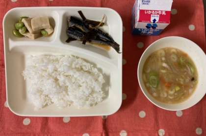 今日のこんだて【ごはん、いわしのしょうが煮、みそ汁、高野どうふの煮もの、牛乳】