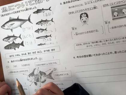 栄養指導をしていただきました。今日は魚の種類や、栄養素について教えてもらいました。魚には、たくさんの栄養がつまっていることがわかりました!!!