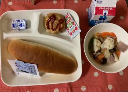 今日のこんだて【コッペパン、ブルーベリージャム、とうふハンバーグ、カリフラワーのスープ煮、固形チーズ、牛乳】