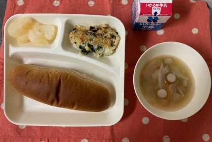 今日のこんだて【こくとうパン、ほたて貝のグラタン、スープ、和なし(カット缶)、牛乳】