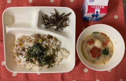今日のこんだて【れんこんのちらしずし、ぞう煮、ごまめ、牛乳】