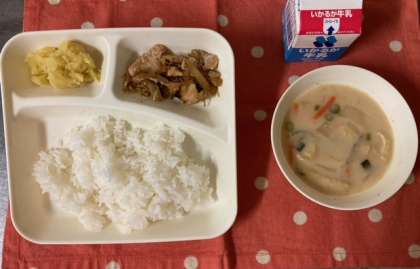今日のこんだて【ごはん、鶏肉の甘辛焼き、かす汁、くりきんとん、牛乳】