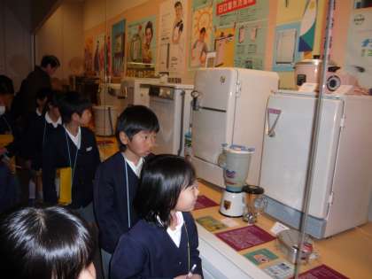 ミュージアムでは、江戸時代の町や家の中の様子を見学し、実際に家の中に上がったり、台所の様子を間近で見たりしました。また、特別展としてレトロ家具展が実施されており、教科書でしかみることのできなかったローラー洗濯機や、今よりも大きい白黒テレビを見ることができました。子どもたちは、大きさや使い方にびっくりしていました。
