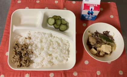 今日のこんだて【ごはん、すき焼き煮、きゅうりのゆずの香あえ、ツナっ葉いため、牛乳】