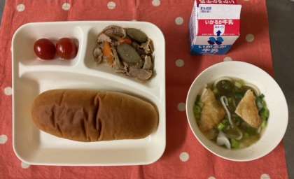 今日のこんだて【黒糖パン、豚肉とごぼうの煮もの、なにわうどん、プチトマト、牛乳】