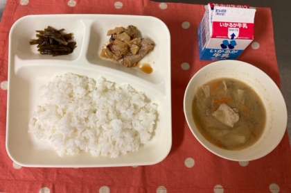 今日のこんだて【ごはん、まぐろの甘辛焼き、豚汁、くきわかめのつくだ煮、牛乳】