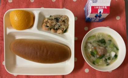 今日のこんだて【黒糖パン、えびと野菜のいためもの、中華がゆ、はっさく、牛乳】