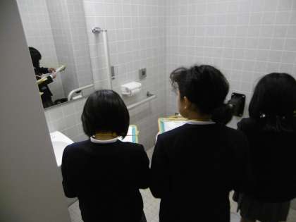 生活科で乗車体験をして駅構内の工夫をさがす学習に向けて、事前学習として校内で点字ブロックや点字板、身障者用のトイレにある手すり、車いすを使う人のためのスロープやエレベーター内の鏡など、たくさんの人にやさしい工夫を見つけました。