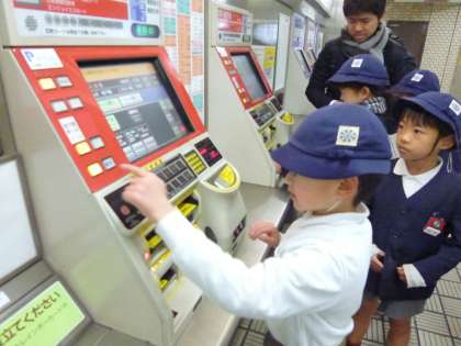 天神橋筋六丁目駅の券売機でお金を握りしめた子どもたちは切符を買い、扇町駅まで地下鉄に乗りました。扇町駅では、エレベータ・スロープ・音声案内板・日本語だけでなく、英語や中国語や韓国語で表示されているホームの案内板など、いろんな人が駅を使うための様々なやさしい工夫を見つけることができました。
