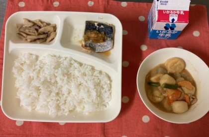 今日のこんだて【ごはん、さごしのおろしじょうゆかけ、一口がんもとさといものみそ煮、れんこんのいためもの、牛乳】