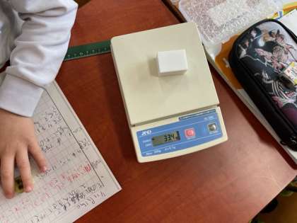 子どもたちは、木と鉄の重さの違いに驚きながら、楽しく実験を行うことができました。最後に、水や牛乳などの液体はどうなのかなと疑問がでてきました。