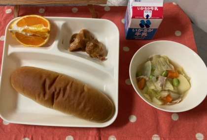 今日のこんだて【黒糖パン、鶏肉のみそバターソース、スープ煮、デコポン、牛乳】