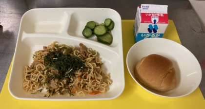 【こくとうパン(1/2)、焼きそば、きゅうりのしょうがづけ、牛乳】