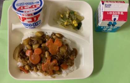 今日のカレーライスは、牛肉と蒸した大豆を主材にしています。また、ラッキーにんじんも登場し、子どもたちは喜んでいました。
