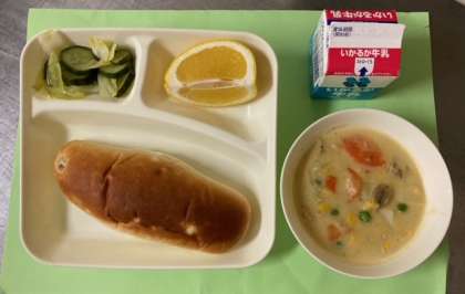 【おさつパン、コーンクリームシチュー、キャベツときゅうりのサラダ、かわちばんかん、牛乳】