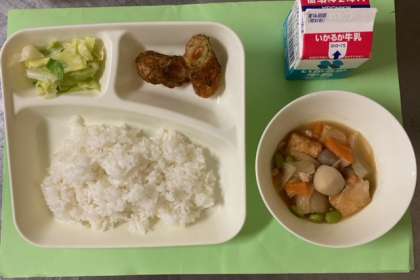 【ごはん、ちくわのいそべあげ、あつあげとさといもの煮もの、あっさりキャベツ、牛乳】