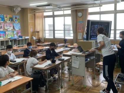 5年生はクラスごとの実施でしたが、6年生と同じく、教室で担任の先生と残った児童が一緒に学習を進める形で行いました。家にいる児童が発表したり、教室にいる児童がカメラの前で発表したりと、デジタルとアナログをうまく使い分けながらの学習となりました。