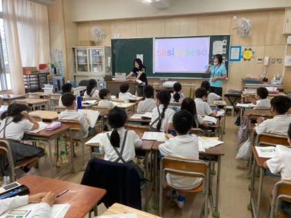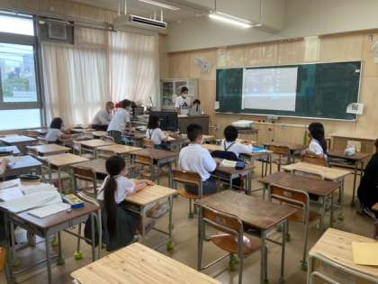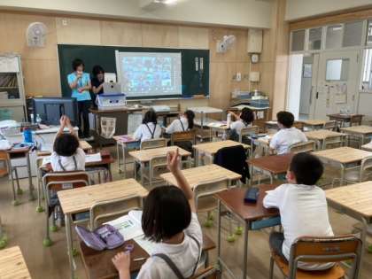 3年生はローマ字についての学習で、スライドを視聴したり、プリントを使って実際にローマ字を書いたりしながら学習しました。教室で学ぶ児童も、オンラインで学ぶ児童も協力し合って、みんなで学習を進めることができました。