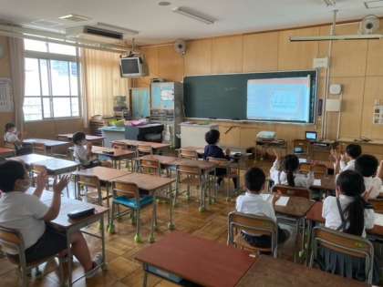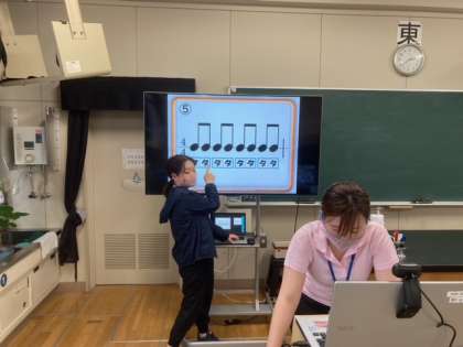 今回は音楽の学習ということで、先生の指示を聞いてリズムを打ったり、自分で考えたリズムを発表したりしました。教室の子どもたちも画面に映った友だちの姿を見て盛り上がり、楽しそうに活動していました。