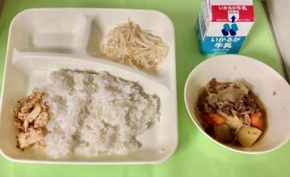 【ごはん、肉じゃが、もやしのゆずの香あえ、ごまかかいため、牛乳】