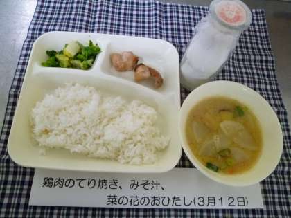 みそ汁にはごぼうやさつまいもなどが入ってヘルシーでした。旬の菜の花は色よく仕上がり、春を感じる一品でした。