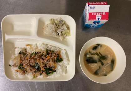 【豚ひき肉とにらのそぼろ丼、みそ汁、キャベツの赤じそあえ、牛乳】