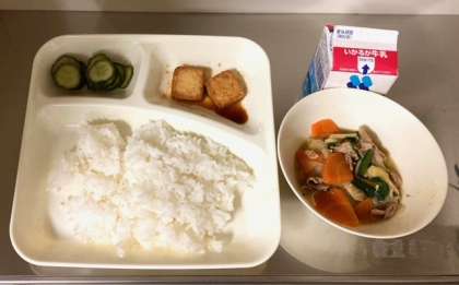 【ごはん、中華煮、あつあげのピリ辛じょうゆかけ、きゅうりの中華和え、牛乳】