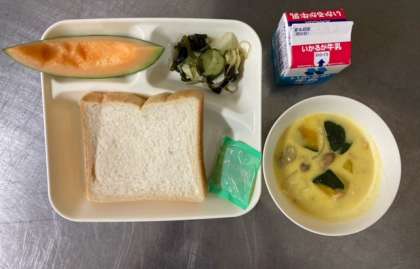 【食パン、りんごジャム、かぼちゃのクリームシチュー、ミックス海藻サラダ、クインシーメロン、牛乳】