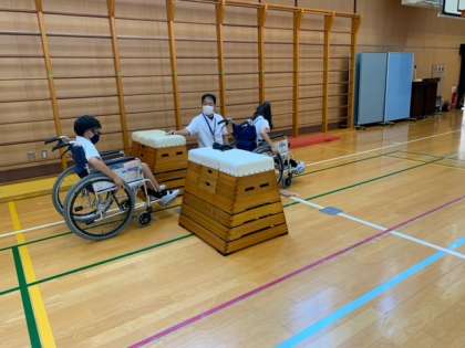 今日は、大阪市立心身障がい者リハビリテーションセンターの方々が来てくださり、車いすの体験学習を行いました。