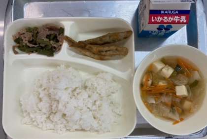 【ごはん、いわしてんぷら、五目汁、豚肉と三度豆のいためもの、牛乳】