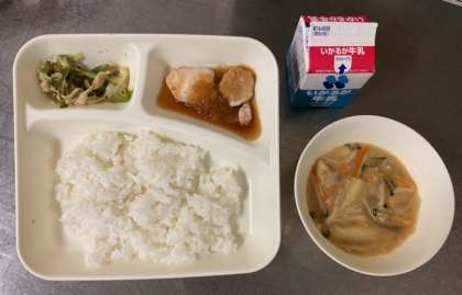 【ごはん、鶏肉のおろしじょうゆかけ、みそ汁、野菜いため、牛乳】