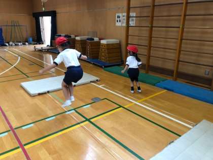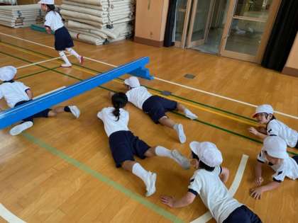 今日の体育はゲストティーチャーが来られました。いつもと違う先生に教えてもらうことに、ワクワク、ドキドキしていました。ゴム飛びでは、「両足を揃えて背筋を伸ばして跳ぶよ。」平均台の下を通るときは、「両手、両足を床にしっかりとつけて動かすよ。」など、自分の体を上手に動かす方法を具体的に教えてもらいました。いっぱい汗をかいて疲れたけど、楽しかった様子でした。
