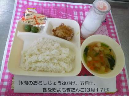 豚肉は、おろしじょうゆでさっぱりと食べられました。ご飯にもよく合いました。春らしいデザートのきな粉よもぎだんごは、自分できな粉をかけて食べるので、香ばしい香りとよもぎだんごのもちもち感がマッチして最高でした。
