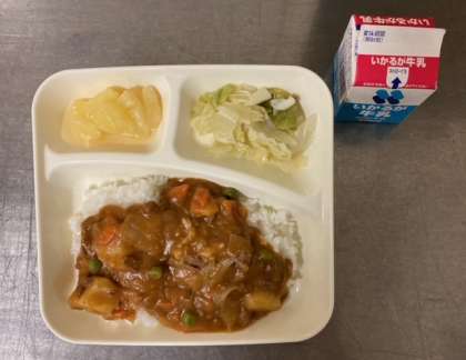 【ハヤシライス、キャベツのゆずドレッシング、パインアップル(カット缶)、牛乳】