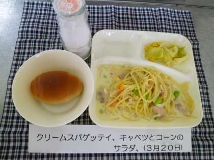 今日はクリームスパゲッテイでした。マッシュルームやむき枝豆が入り、クリームでコクが出ていて彩りのよいパスタに仕上がっていました。