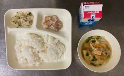 【ごはん、鶏肉のしょうゆマヨネーズ焼き、五目汁、切干し大根のゆずの香あえ、牛乳】